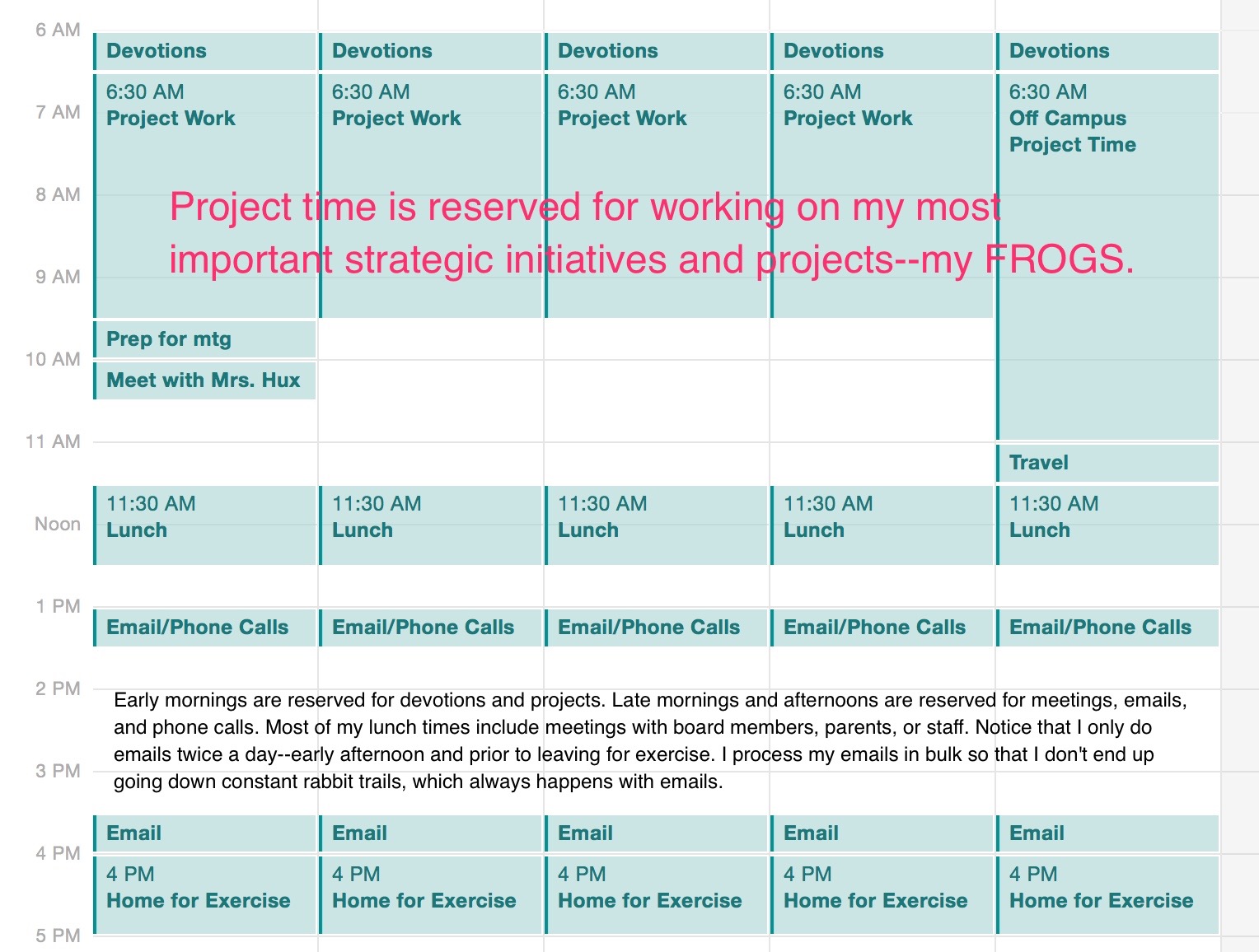 1. Scheduling your morning hours for two things: time with God and your most important projects (your frogs).