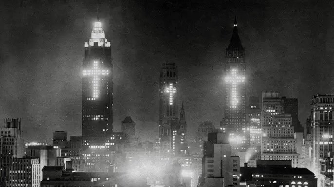 Buildings with lighted crosses to honor Good Friday in April 1956. Left to right: 60 Wall Tower, 20 Exchange Place (formerly known as City Bank Farmers Trust Co.) and 40 Wall Street. Photo taken on April 5, 1956. (Ed Peters/NY Daily News Archive via Getty Images)