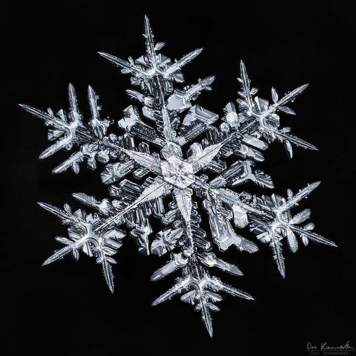 I digress back to the science. More crystals form on the outside of the center ice crystal as water vapor collects and freezes. These crystals grow faster on the corners of the hexagon-shaped center crystal causing six dendrites to form on the snowflakes. The six main dendrites continue to grow smaller dendrites as water vapor collects and freezes on the crystals. As the crystal gets bigger and heavier, it falls from the cloud, continuing to form as it falls to the ground. This process causes every snowflake to be unique and each snowflake is remarkably beautiful.
