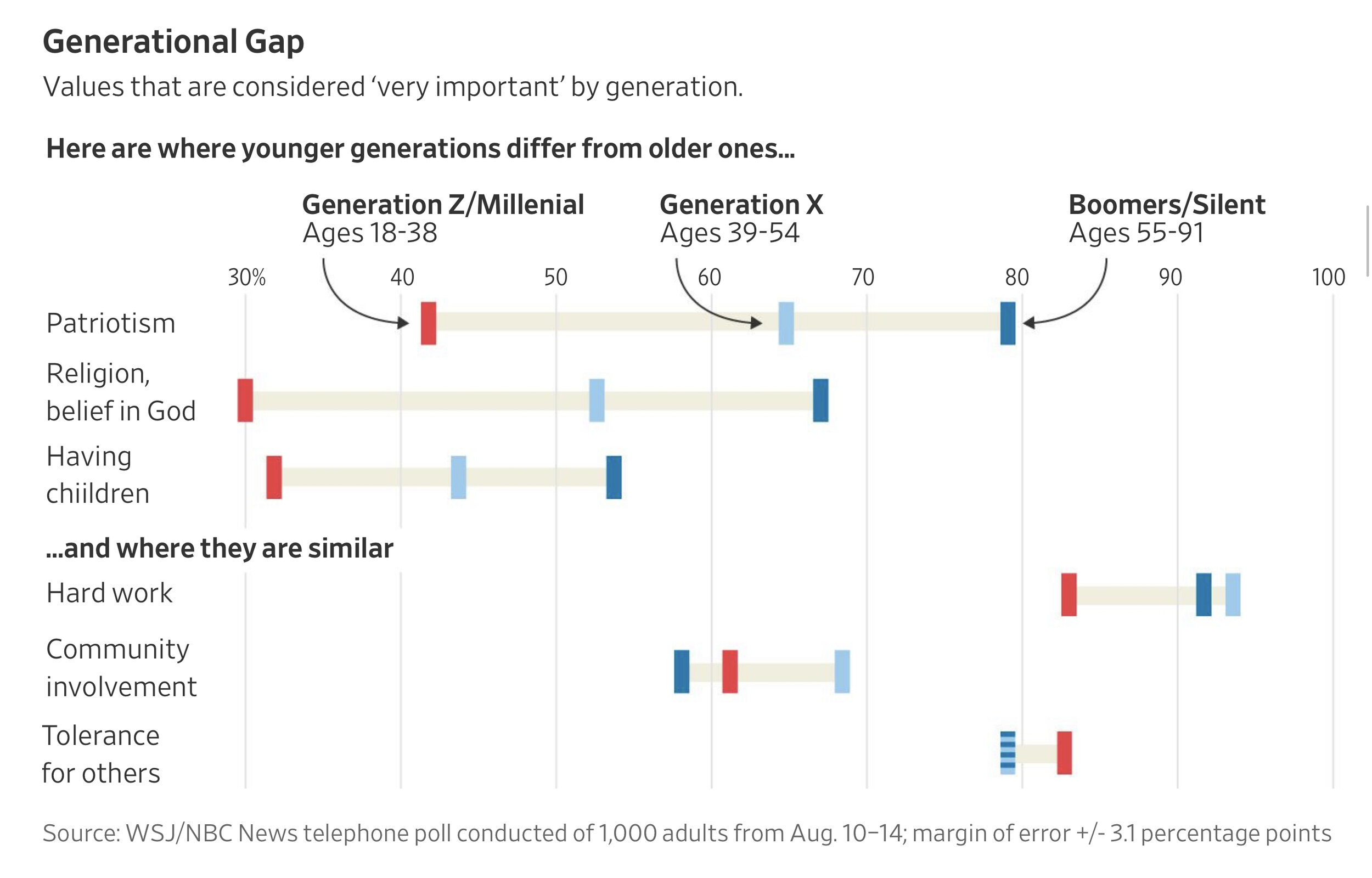 that the values that Americans say define the national character are changing, as younger generations rate patriotism, religion and having children as less important to them than did young people two decades ago. Views varied sharply by age. Among people 55 and older, for example, nearly 80% said patriotism was very important, compared with 42% of those ages 18-38—the millennial generation and older members of Gen-Z. Two-thirds of the older group cited religion as very important, compared with fewer than one-third of the younger group. 1